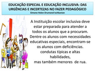 O documento discute a educação inclusiva e as adequações curriculares necessárias para atender alunos com necessidades educacionais especiais. A escola inclusiva deve se adaptar para atender a todos os alunos e o currículo deve ser flexível para contemplar as diversas necessidades, com adaptações individuais quando necessário. A comunidade escolar deve discutir conjuntamente as estratégias pedagógicas mais adequadas.