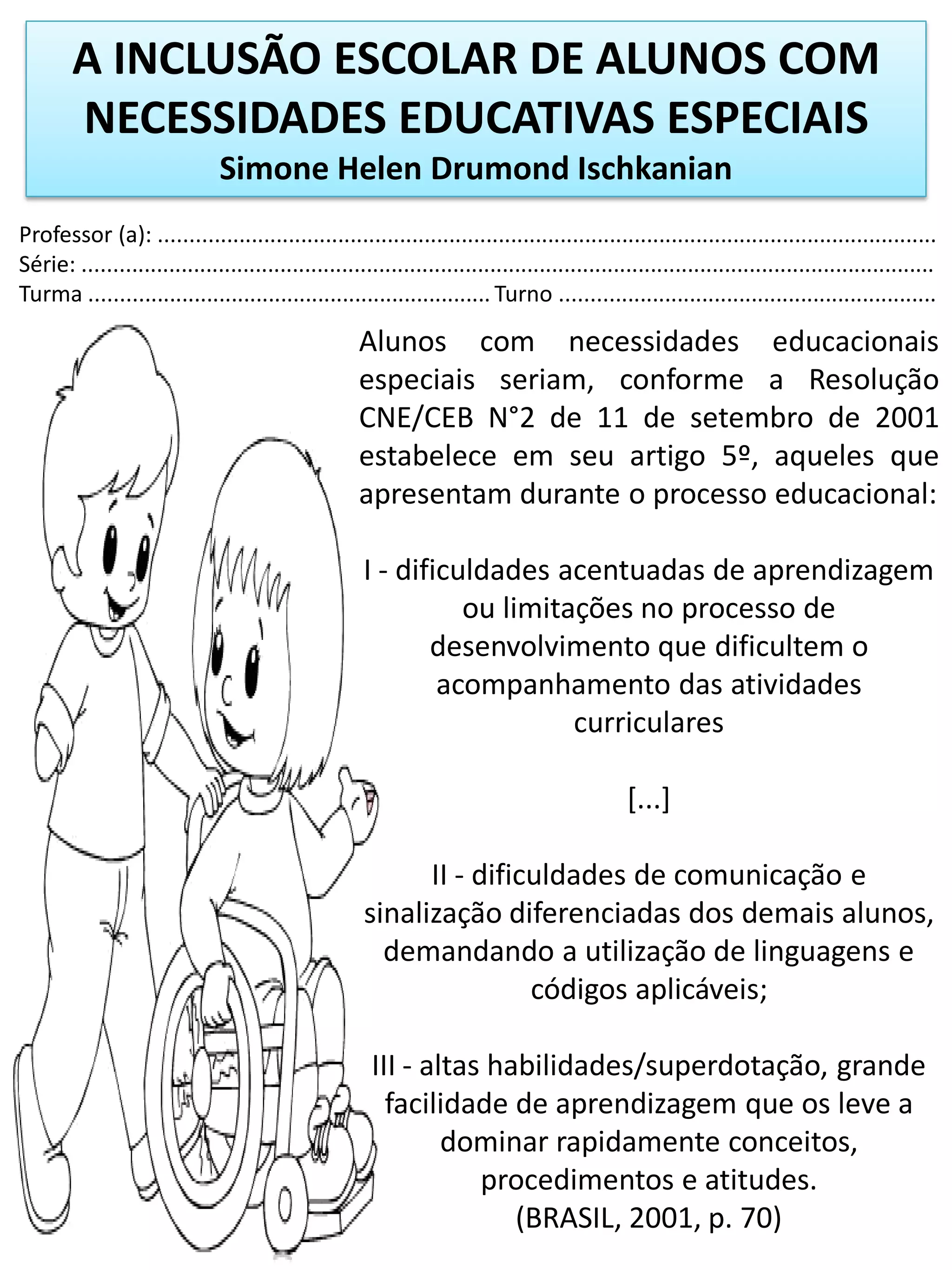 O documento discute a inclusão escolar de alunos com necessidades educacionais especiais de acordo com a legislação brasileira. Ele define alunos com necessidades educacionais especiais como aqueles que apresentam dificuldades de aprendizagem, limitações no desenvolvimento ou na comunicação. Além disso, descreve que a política nacional passou a considerar como público da educação especial aqueles com deficiência, transtornos globais do desenvolvimento ou altas habilidades.