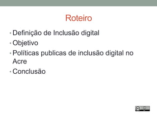 O documento discute a inclusão digital no Acre, definindo-a como garantir o acesso à informação através das tecnologias da informação e comunicação. Ele descreve as políticas públicas de inclusão digital no estado, incluindo os telecentros que fornecem acesso gratuito à internet em 31 pontos, e o programa Floresta Digital que disponibiliza banda larga sem fio gratuita.