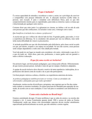 O documento discute a inclusão escolar no Brasil segundo a perspectiva da educadora Maria Teresa Mantoan. Ela defende que todas as crianças, independente de deficiência, devem ter o direito de estudar em escolas regulares. No entanto, reconhece que o Brasil ainda precisa progredir para garantir que todas as escolas sejam realmente inclusivas.