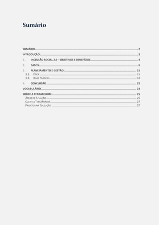 O documento discute como projetos de inclusão social estão utilizando ferramentas da Web 2.0 para promover maior colaboração e cooperação em prol de uma sociedade mais justa e integrada. Exemplos de casos são apresentados, como o site One Laptop per Child que usa wikis para traduzir conteúdo e acompanhar bugs, e o Change.org que conecta pessoas preocupadas com problemas sociais.