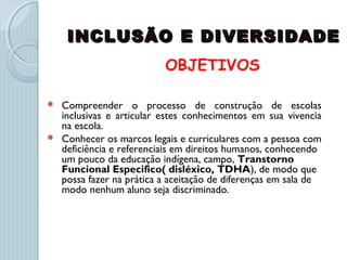 O documento discute a inclusão e diversidade na educação. Ele descreve uma aula sobre o tema, com objetivos de compreender processos de construção de escolas inclusivas e conhecer direitos de pessoas com deficiência. Além disso, discute a importância de romper com visões excludentes e promover equidade, vendo a todos como iguais, mas também reconhecendo suas diferenças.