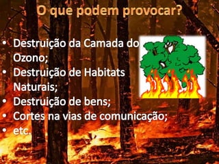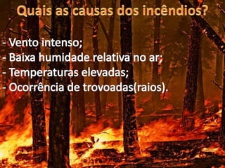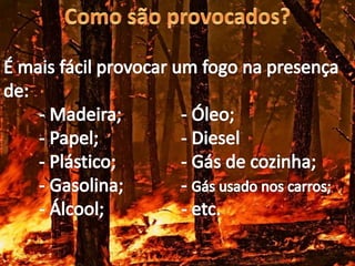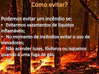 Um incêndio é um fogo não controlado que pode ser mortal devido à inalação de gases ou queimaduras graves. Incêndios podem ocorrer naturalmente por lava vulcânica ou calor excessivo, ou por ações humanas como jogar cigarros no chão. Incêndios representam um grande perigo para a vida e propriedade.