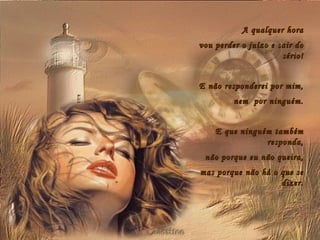A pessoa está cansada de esconder suas dores e fingir estar em paz. Ela diz que um dia pode perder o controle e fazer coisas que nunca fez antes, apenas para não ter arrependimentos. Irá aproveitar a vida sem medo, descalça, molhada pela chuva, com o rosto no sol, cabelos ao vento, comendo o que quiser e sem se preocupar com o relógio ou o futuro.