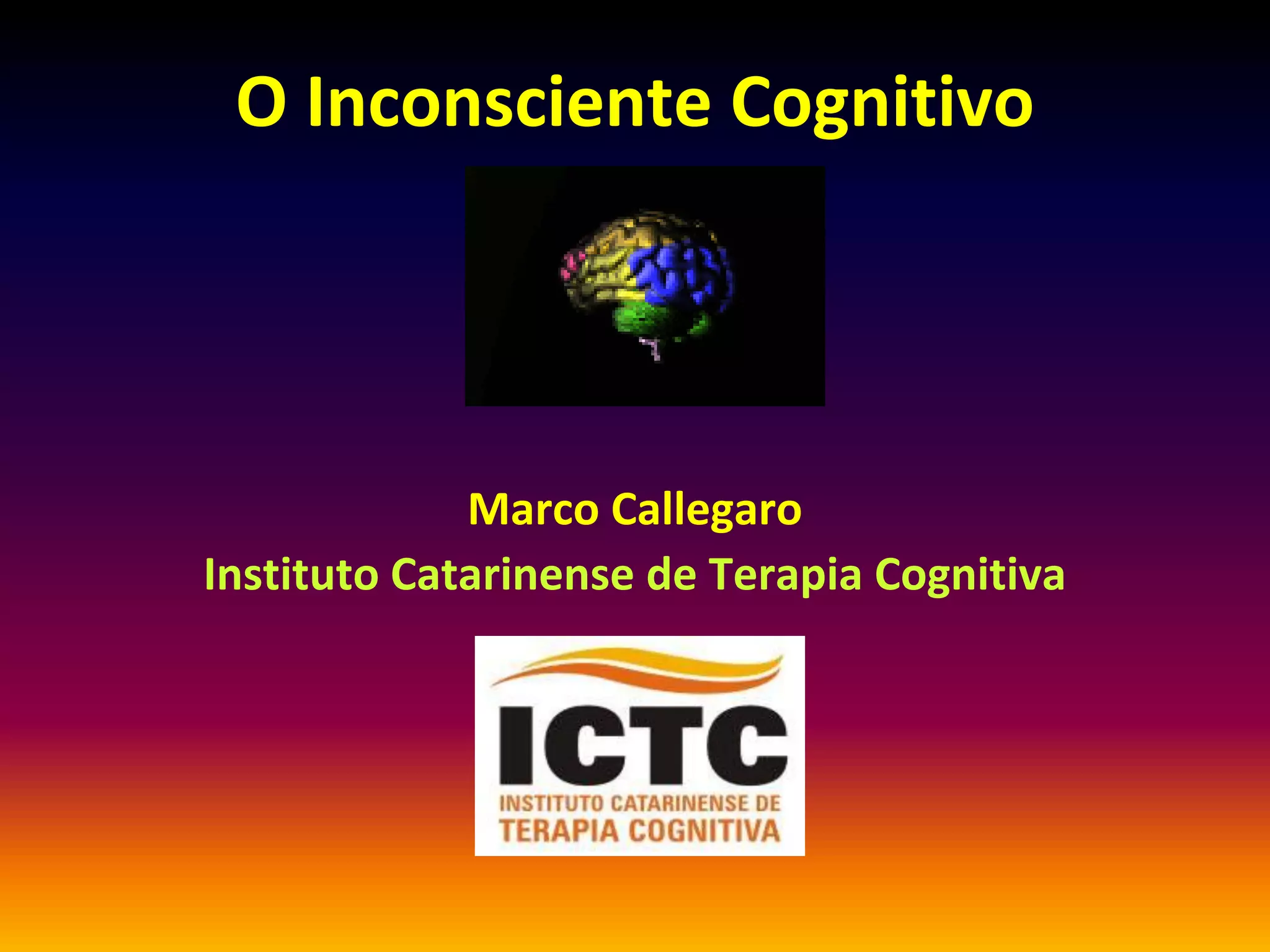 O documento discute o inconsciente cognitivo e como processos mentais inconscientes influenciam o pensamento e comportamento. Ele explica como a terapia cognitiva pode treinar o cérebro a substituir esquemas mentais desadaptativos por processos cognitivos mais funcionais e realistas.