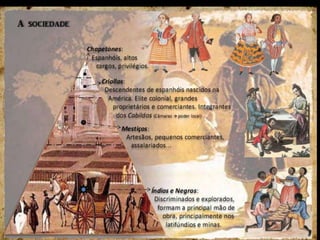 Este documento apresenta um resumo sobre a independência da América Espanhola em 1 aula. Ele discute o processo histórico da independência, comparando os aspectos coloniais das Américas Espanhola e Portuguesa e as formas de trabalho e diferenças sociais. Referências são fornecidas para pesquisa adicional.