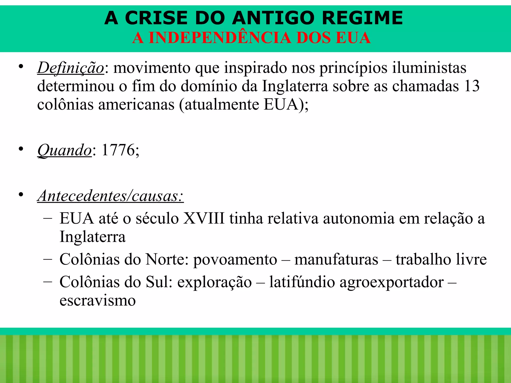 O documento descreve a independência dos Estados Unidos da Inglaterra em 1776, motivada pelos ideais iluministas e pelas restrições comerciais impostas pela coroa britânica às 13 colônias americanas, levando à guerra de independência e à Declaração de Independência em 1776, reconhecendo os EUA como nação independente em 1783.