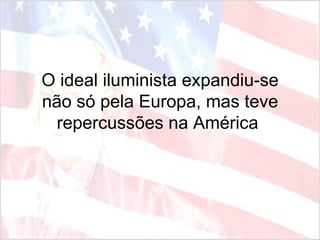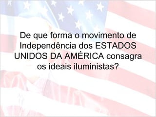 O documento descreve como os ideais iluministas influenciaram o movimento de independência dos Estados Unidos da América. A Declaração de Independência e a Constituição Americana consagraram princípios iluministas como a igualdade de todos os homens, os direitos naturais do povo e a divisão de poderes. O documento também fornece contexto histórico sobre os motivos e o processo que levaram à independência dos EUA.
