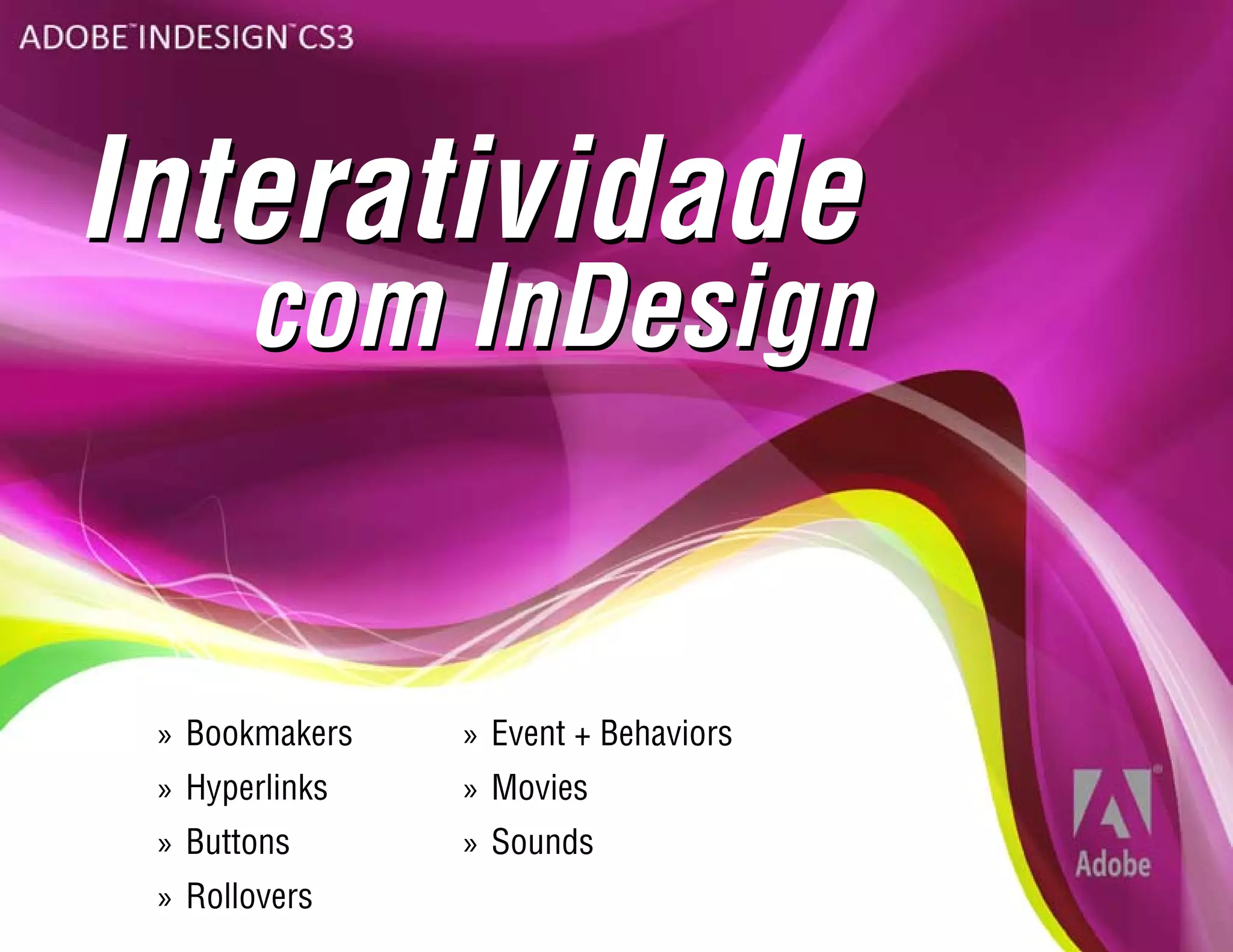 O documento descreve os recursos interativos do InDesign, incluindo bookmarkers, hiperlinks, botões, rollovers, eventos e comportamentos, vídeos e sons. Bookmarkers são como âncoras para referenciar páginas no documento. Hiperlinks permitem definir destinos como páginas, URLs ou âncoras de texto. Qualquer elemento no InDesign pode ser convertido em botão. Rollovers permitem modificar a aparência do botão em diferentes estados do mouse. Eventos referem-se aos movimentos do mouse e comportamentos indicam a ação