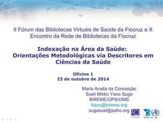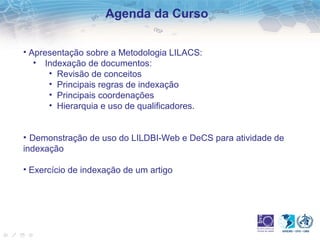 Este documento apresenta as diretrizes para indexação de documentos na área da saúde utilizando o vocabulário controlado DeCS. A oficina aborda conceitos e regras de indexação, demonstração do uso do LILDBI-Web e DeCS para atividade de indexação e exercício prático de indexação de um artigo.