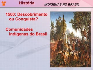 O documento discute a história das comunidades indígenas no Brasil, incluindo suas origens pré-históricas, características culturais e sociais antes da colonização, os primeiros contatos com os colonizadores que inicialmente foram amistosos mas depois levaram à violência e genocídio, e protestos atuais sobre direitos territoriais e projetos de infraestrutura.