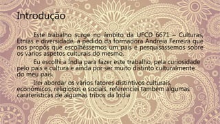 Este documento fornece um resumo da cultura da Índia em 3 frases ou menos: