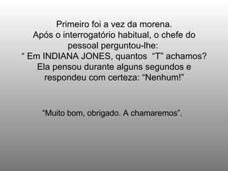 Uma entrevista de emprego testou candidatas com uma pergunta sobre o número de letras "T" no título "Indiana Jones". As primeiras duas acertaram que não havia nenhum "T", enquanto a terceira calculou raízes quadradas com uma calculadora antes de dar a resposta errada de "32".