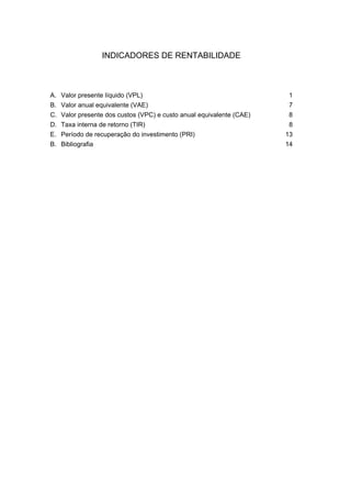Este documento discute vários indicadores de rentabilidade para avaliar projetos de investimento público, incluindo:
