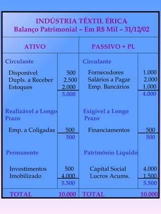 O documento apresenta o balanço patrimonial e a demonstração de resultados de uma indústria têxtil no ano de 2002. O balanço mostra que a empresa tem ativos circulantes de R$5.000 e patrimônio líquido de R$5.500. A demonstração de resultados indica que a empresa teve receita de R$5.000 e lucro líquido de R$1.500 no período.