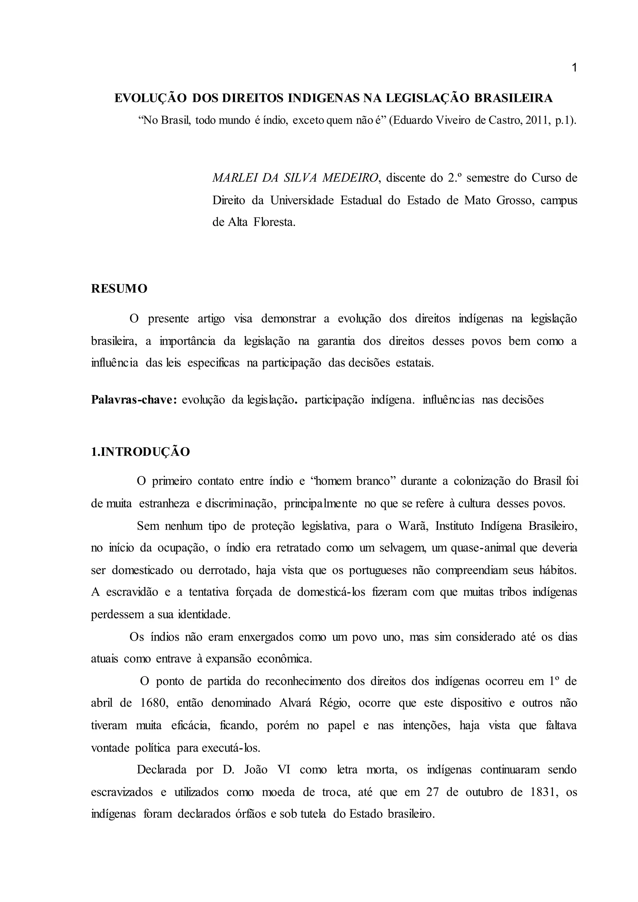 O documento descreve a evolução dos direitos indígenas na legislação brasileira ao longo da história. Começando pela visão dos indígenas como "selvagens" durante a colonização, passando pelas primeiras leis protetivas no século XIX, até as garantias constitucionais de 1988 que reconhecem os direitos originários dos povos indígenas.