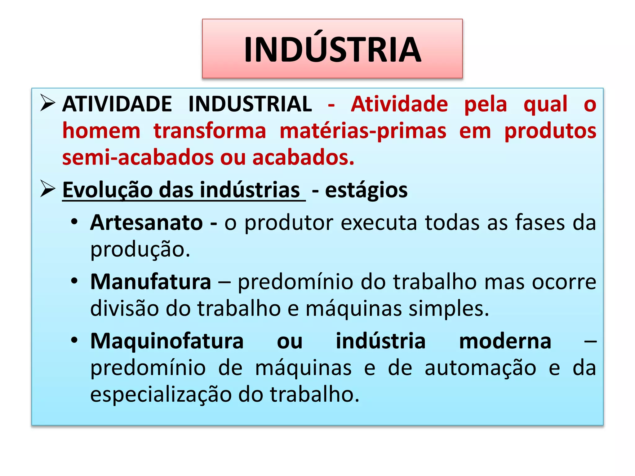 O documento descreve a evolução da indústria no Brasil desde o período colonial até os dias atuais, passando pelas fases da proibição, abertura, substituição de importações e internacionalização. Também define os principais tipos de aglomerações industriais e classificações de indústrias, além de fatores de localização e os impactos de guerras e crises econômicas no desenvolvimento industrial brasileiro.