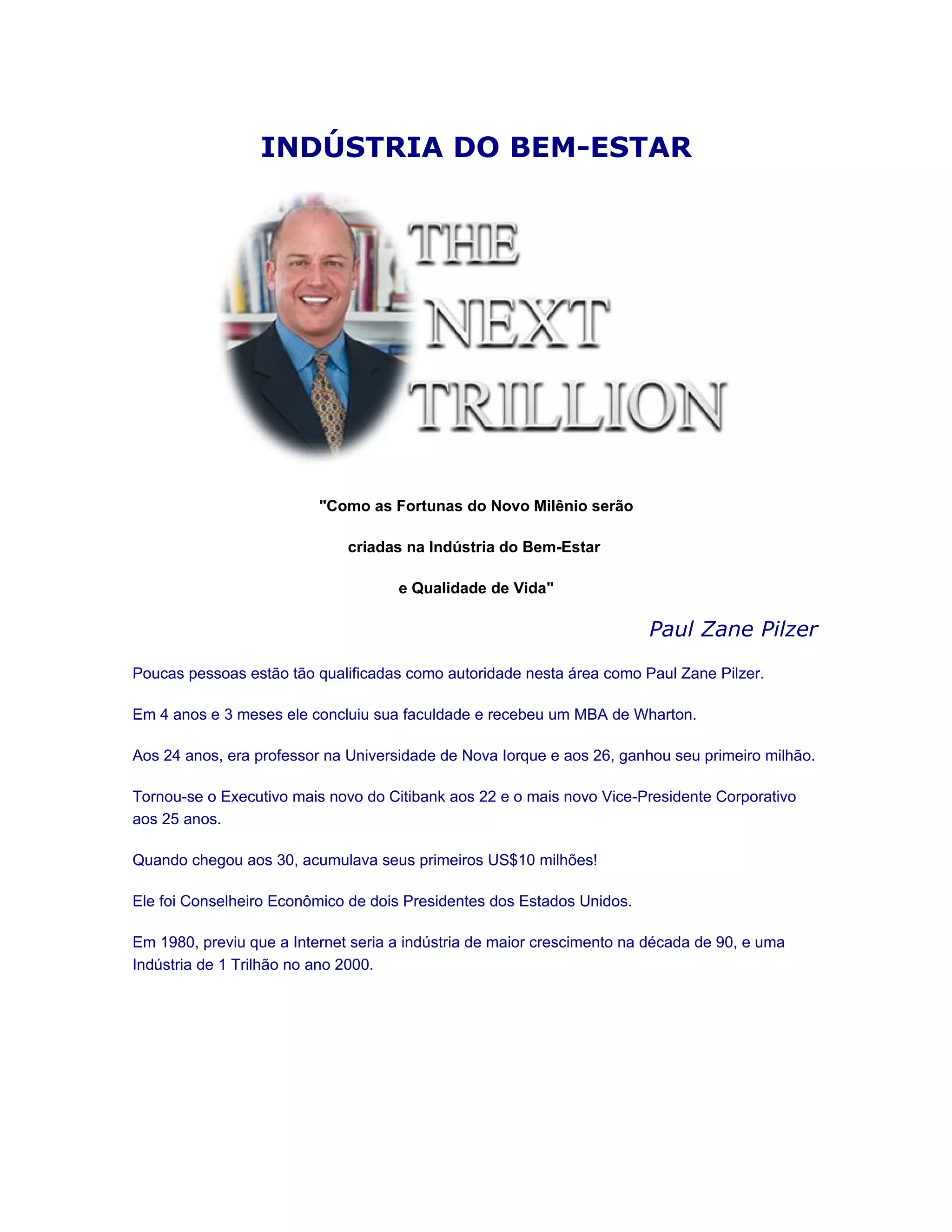 Este documento discute a ascensão da indústria do bem-estar e qualidade de vida como a próxima grande tendência econômica. O autor Paul Zane Pilzer argumenta que esta indústria atingirá US$ 1 trilhão em vendas anuais nos EUA até 2010, impulsionada pelo envelhecimento da população e preocupação crescente com a saúde. Ele também sugere que as empresas de venda direta são o melhor modelo de negócios para aproveitar esta oportunidade em expansão.