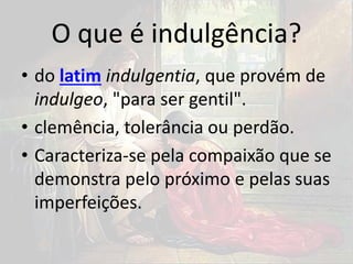O documento discute o conceito de indulgência no Espiritismo, definindo-o como clemência, tolerância ou perdão. Explica que é um dos sentimentos mais elevados e envolve não ver os defeitos dos outros, evitar comentá-los e divulgá-los. Também é a facilidade em perdoar os erros cometidos pelos outros.