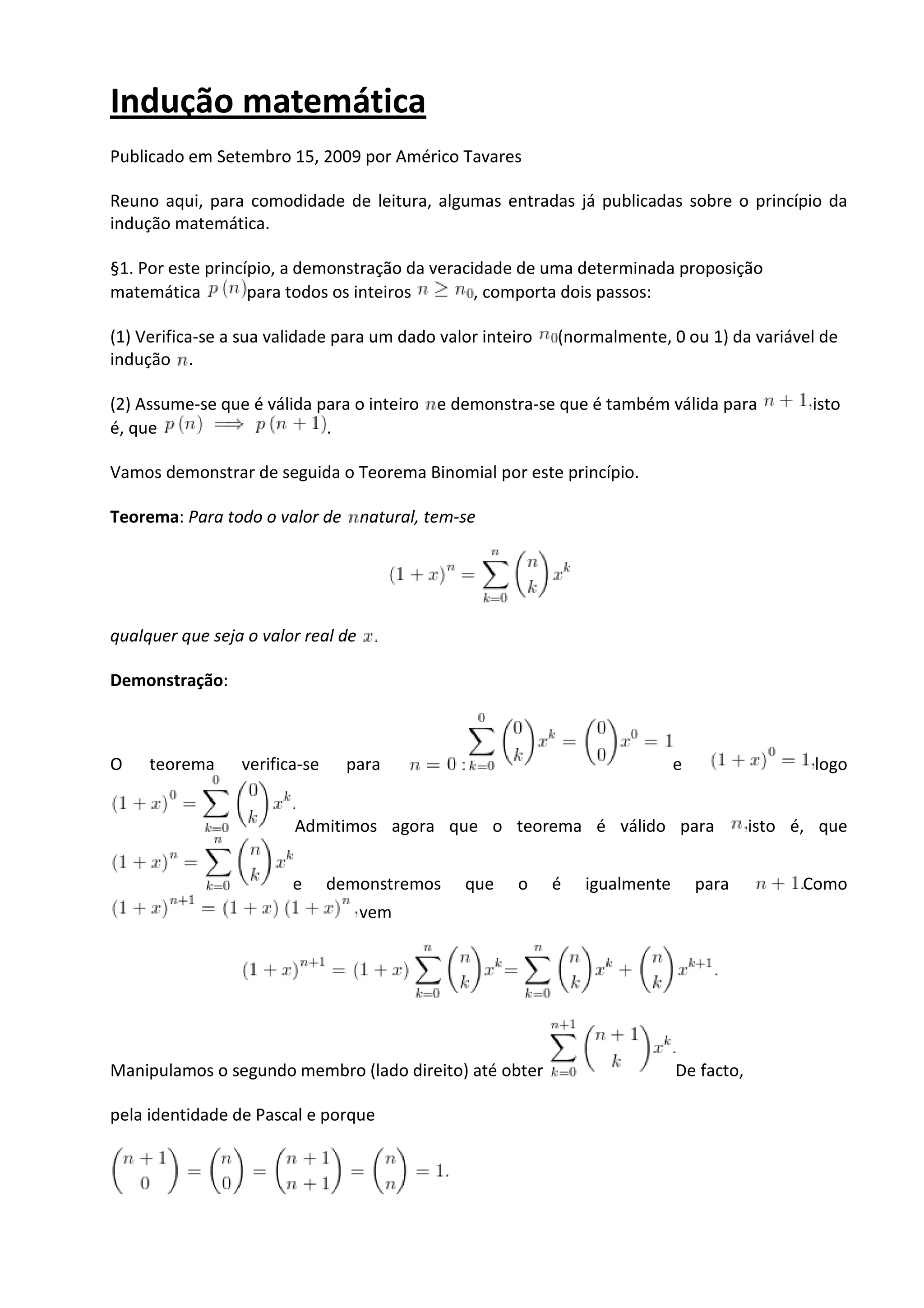 Este documento discute o princípio da indução matemática e fornece exemplos de sua aplicação. Ele explica que a indução matemática envolve provar uma propriedade para o caso base e mostrar que é hereditária. O documento também demonstra o teorema binomial e uma identidade sobre a função gama usando indução.
