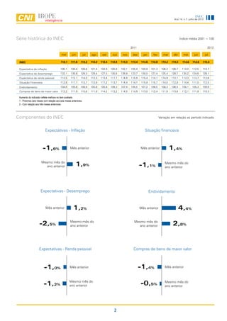 Em julho de 2012, o Índice Nacional de Expectativa do Consumidor (INEC) aumentou 0,4%, refletindo uma leve melhora na confiança do consumidor, embora a preocupação com a inflação tenha aumentado. A situação do endividamento apresentou melhora, enquanto as expectativas sobre emprego e intenção de compras mostraram sinalizações misturadas. Apesar da estabilidade do índice, o otimismo é maior em comparação ao ano anterior.