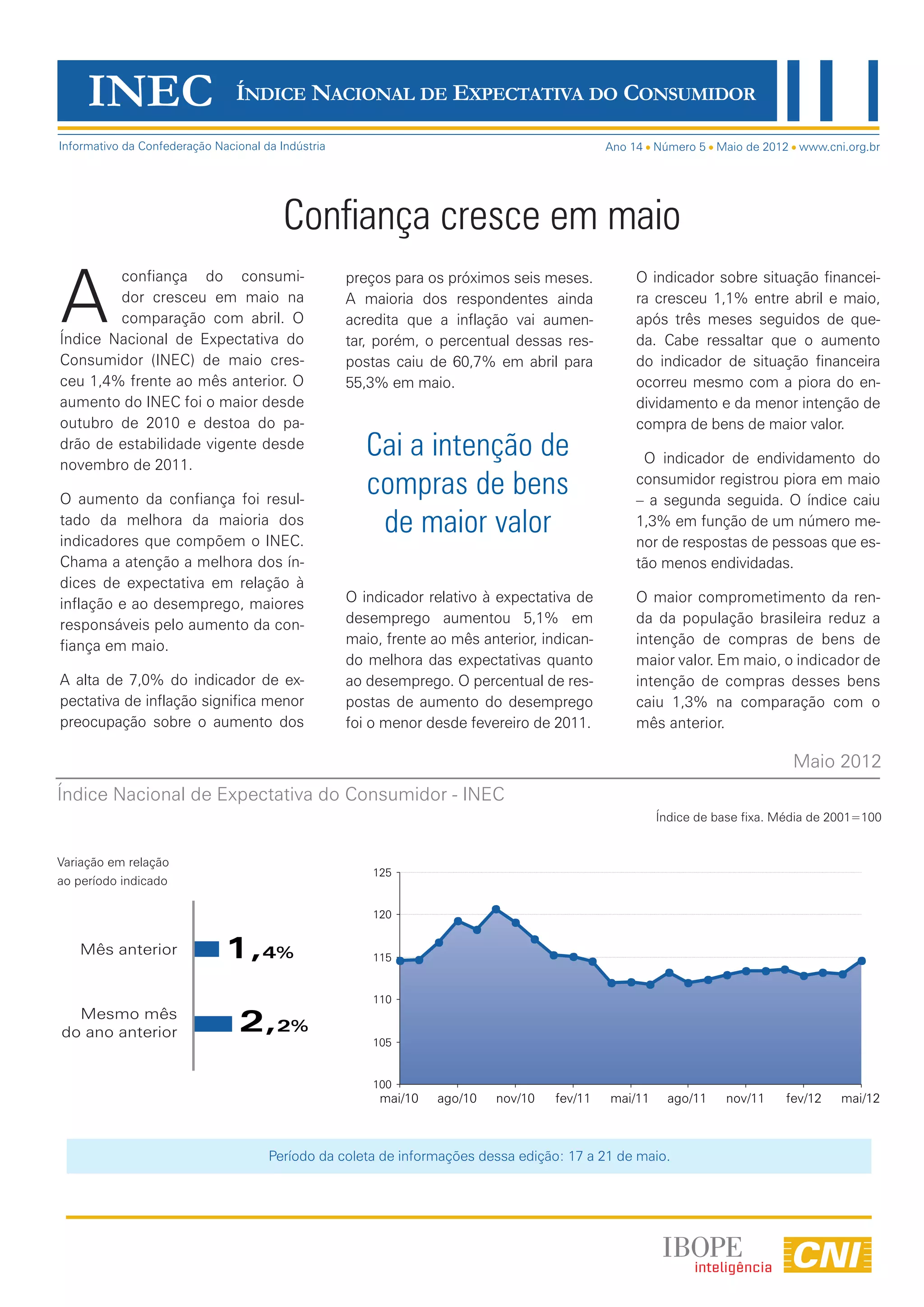 1) A confiança do consumidor cresceu em maio, com aumento do Índice Nacional de Expectativa do Consumidor (INEC) de 1,4% em relação a abril.