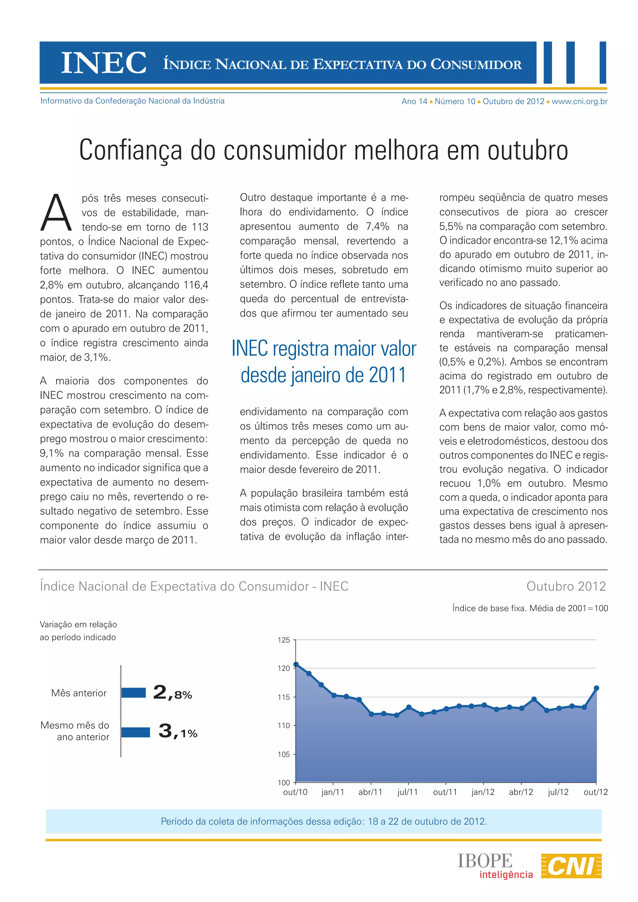 O documento relata que o Índice Nacional de Expectativa do Consumidor (INEC) registrou forte melhora em outubro, alcançando o maior valor desde janeiro de 2011. A maioria dos componentes do INEC apresentou crescimento na comparação com setembro, com destaque para a expectativa de evolução do desemprego. O endividamento também apresentou queda no mês.