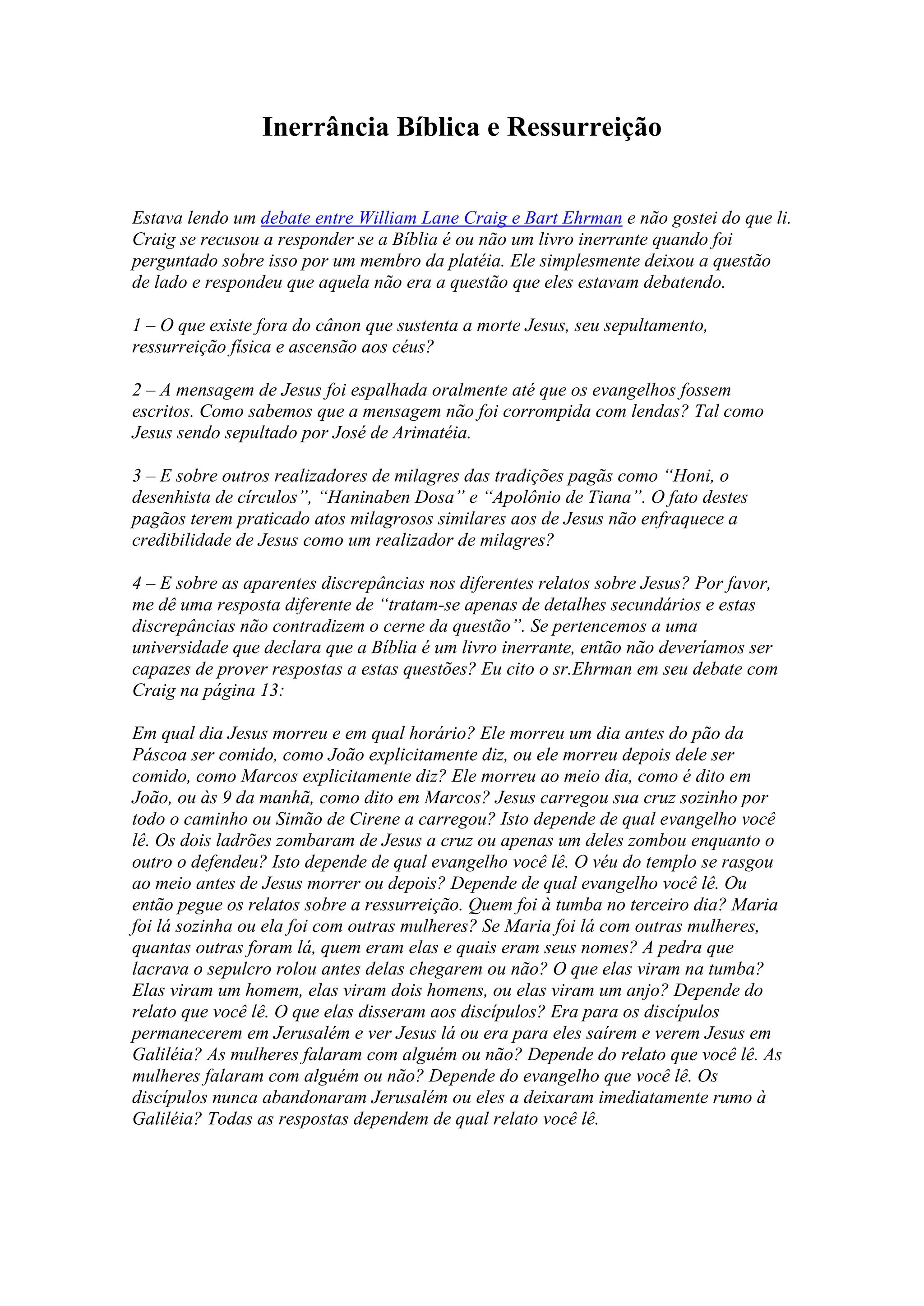 1) O documento discute a inerrância bíblica e a ressurreição de Jesus, levantando questões sobre as evidências históricas e aparentes discrepâncias nos evangelhos.