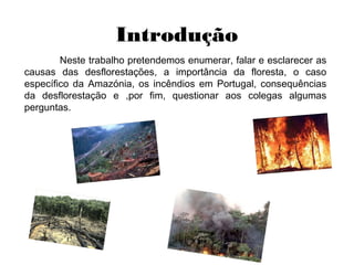 Este documento discute as causas da desflorestação, incluindo incêndios, chuvas ácidas e construção civil. Ele também cobre a importância das florestas para a fotossíntese e biodiversidade, bem como as consequências da desflorestação como aquecimento global e perda de habitats. O documento fornece detalhes sobre a desflorestação na Amazônia e os incêndios florestais em Portugal.