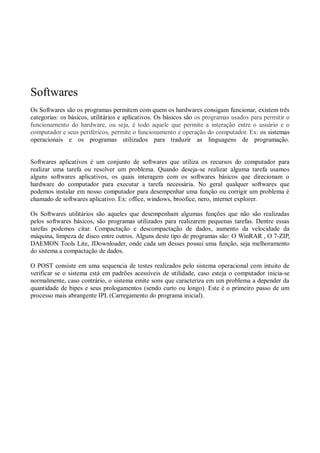 O documento discute diferentes tipos de softwares, incluindo softwares básicos que permitem a interação entre usuário e hardware, softwares aplicativos que realizam tarefas específicas, e softwares utilitários que realizam pequenas tarefas como compactação de dados. Ele também explica o que é o POST, que verifica se o sistema está funcionando corretamente antes do início.