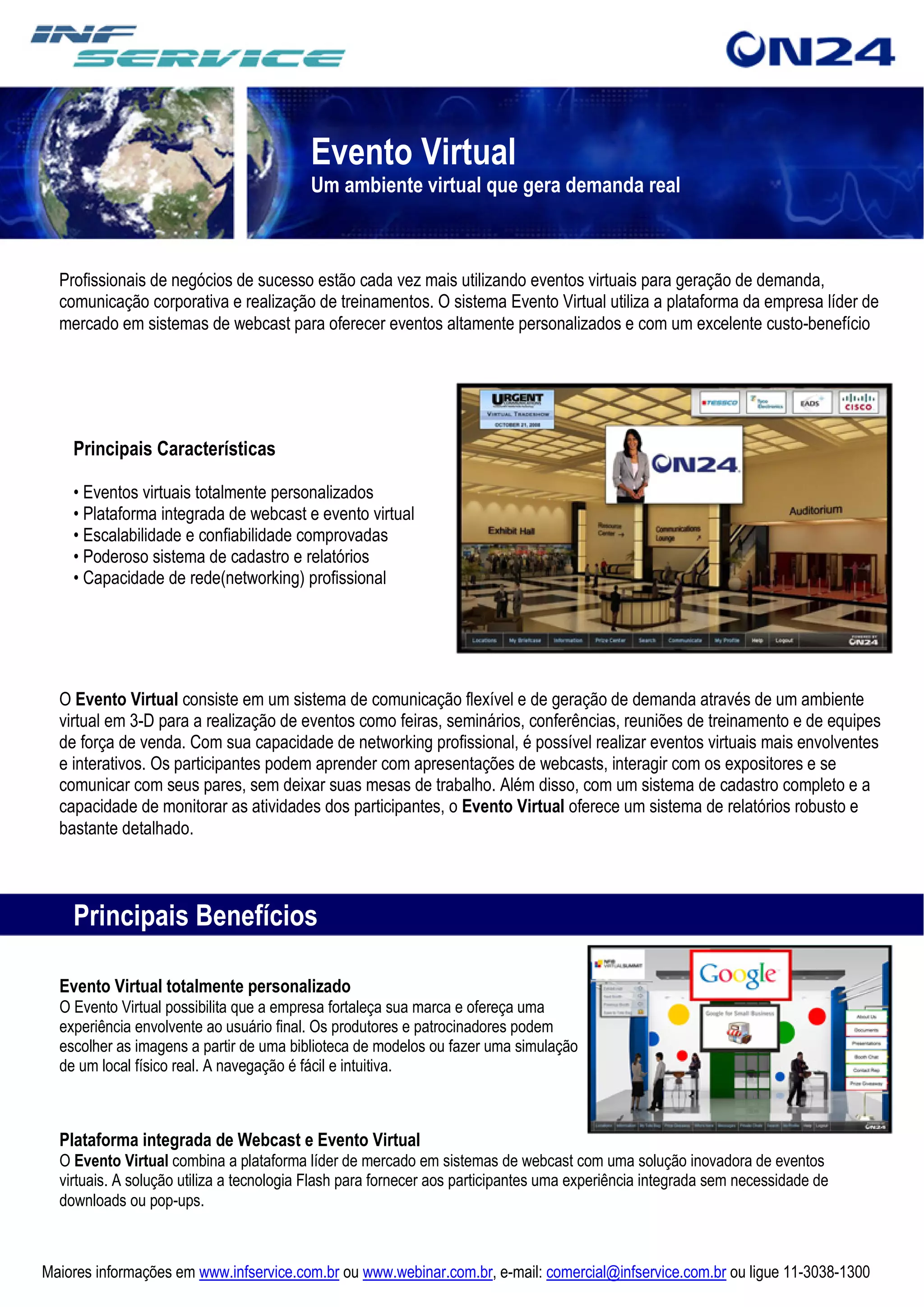 O documento descreve um sistema de eventos virtuais chamado Evento Virtual que permite a realização de eventos como feiras, seminários e conferências em um ambiente virtual 3D. O sistema oferece funcionalidades como estandes personalizados para expositores, auditório para webcasts ao vivo, ferramentas de networking e relatórios detalhados sobre os participantes. A plataforma é escalável e confiável para eventos ao vivo.