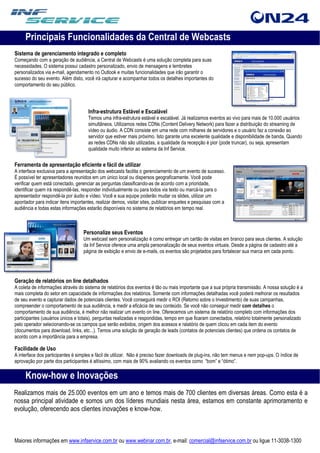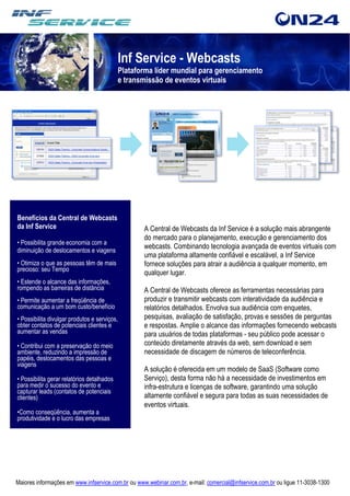 A Central de Webcasts da Inf Service fornece uma plataforma completa para planejamento, execução e gerenciamento de eventos virtuais de forma escalável e confiável. Ela oferece ferramentas para produzir webcasts interativos, gerar relatórios detalhados e capturar leads. Sua interface facilita a apresentação dos eventos de forma colaborativa e distribuída.
