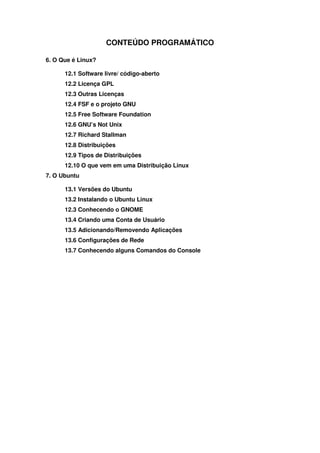 O documento apresenta um conteúdo programático sobre Linux e o sistema operacional Ubuntu. É dividido em duas seções principais: a primeira seção explica conceitos básicos sobre o que é Linux, suas licenças, distribuições e personalidades importantes. A segunda seção foca no Ubuntu, apresentando suas versões, instalação e configurações.