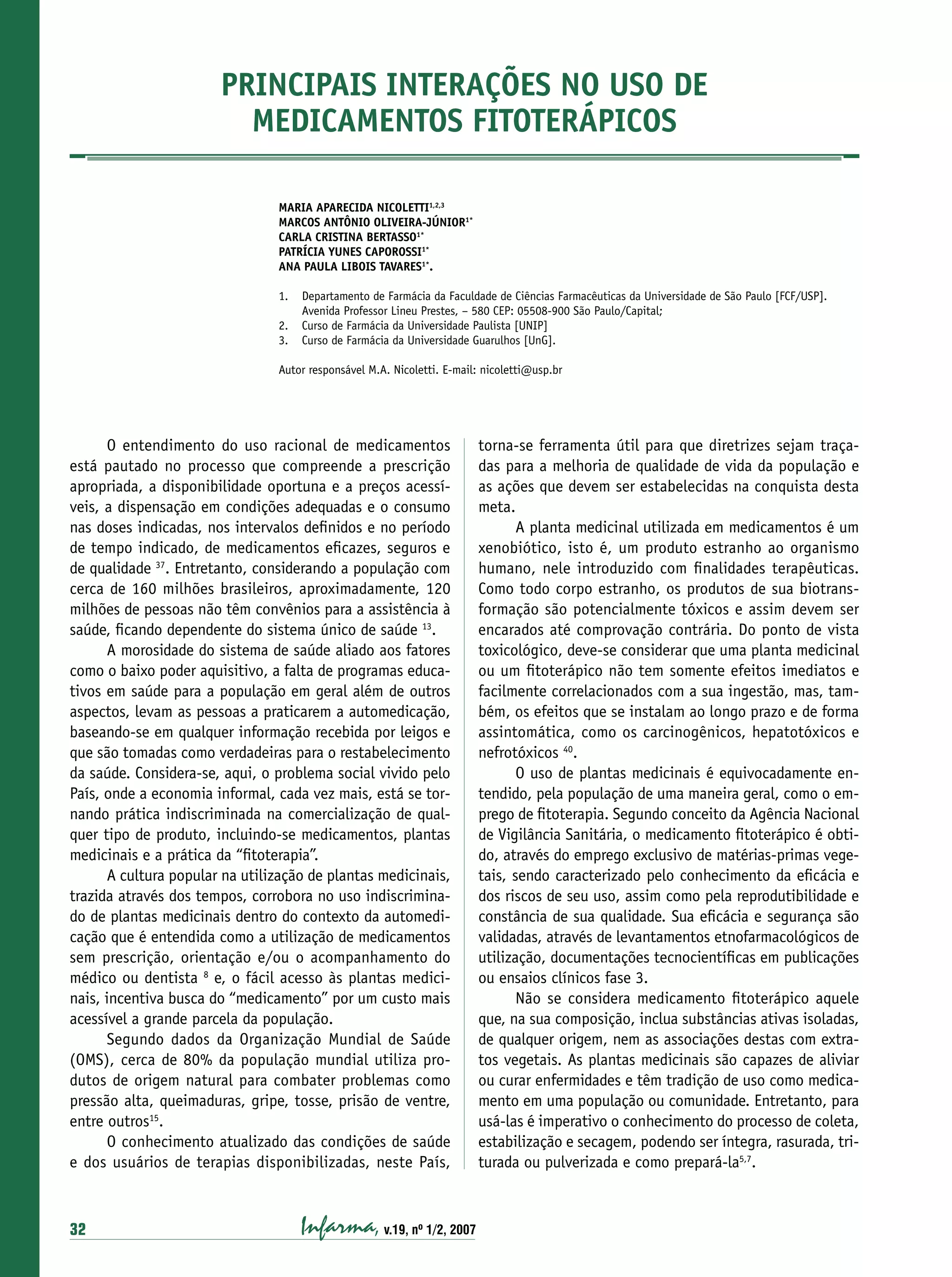 O documento discute as principais interações medicamentosas de fitoterápicos comumente utilizados no Brasil, como alcachofra, alho, boldo e camomila. Essas interações podem intensificar ou diminuir os efeitos de medicamentos, levando a problemas de saúde. É importante que profissionais da saúde e o público em geral conheçam essas interações para um uso seguro de fitoterápicos.