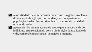 1) O documento discute infertilidade conjugal, definindo-a como a ausência de concepção após 1 ano de tentativas sexuais regulares sem contracepção.