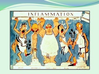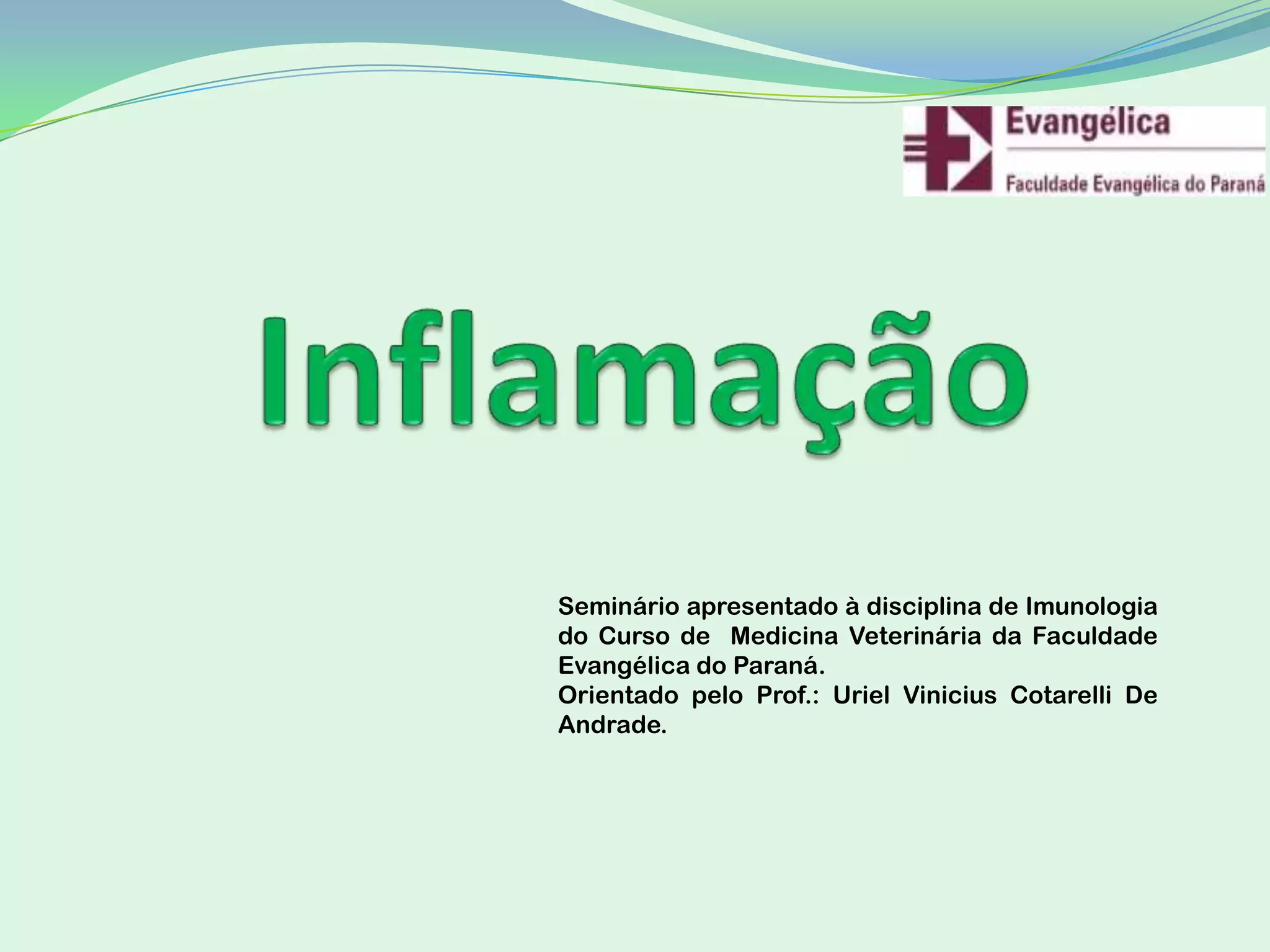 Este documento resume um seminário sobre inflamação apresentado para estudantes de medicina veterinária. Ele discute conceitos básicos de inflamação, incluindo células envolvidas, mediadores químicos, tipos de inflamação aguda e crônica, e resolução da inflamação. O seminário foi orientado pelo professor Uriel Vinicius Cotarelli De Andrade e apresentado por cinco estudantes.