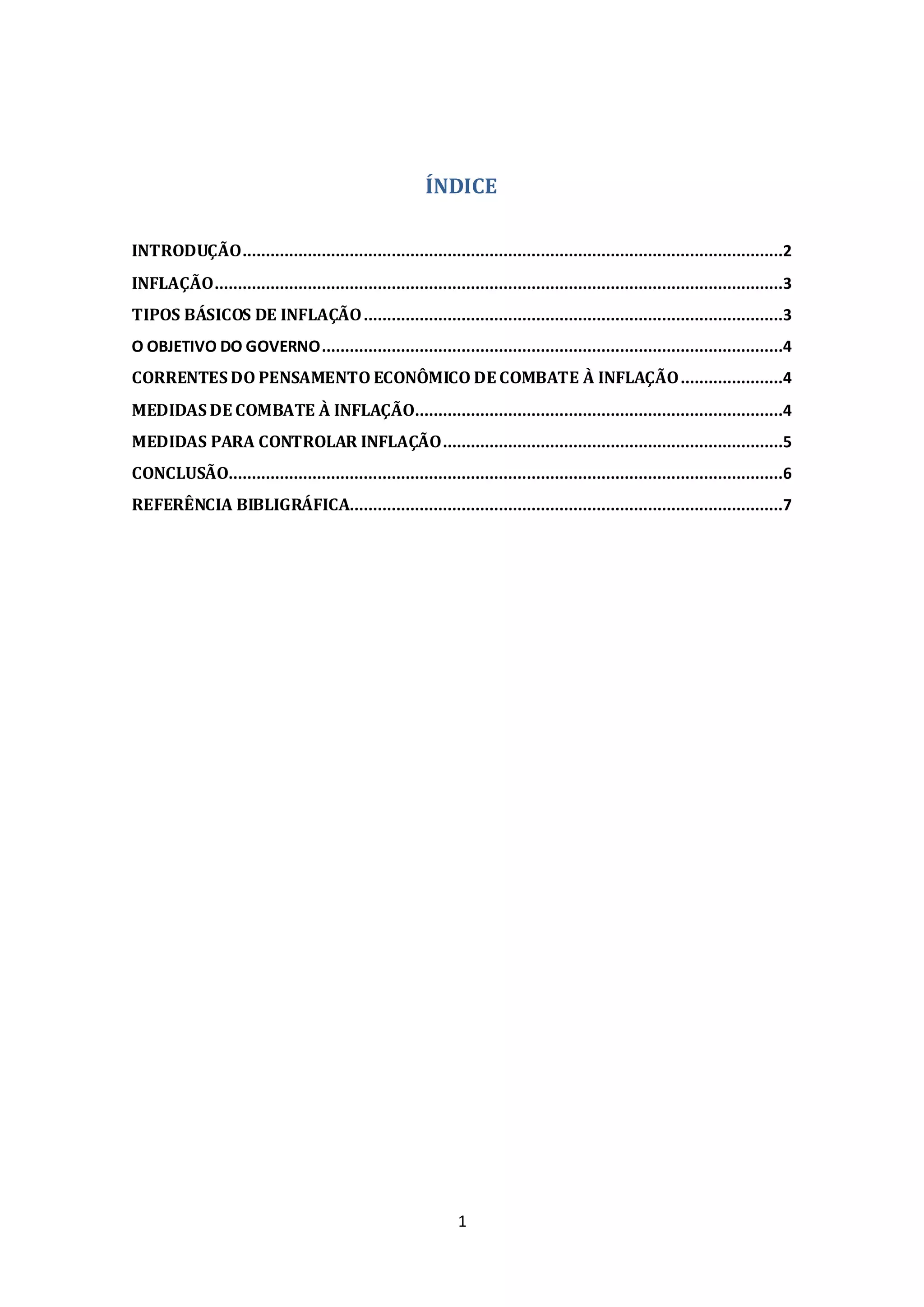 O documento analisa a inflação como um aumento generalizado dos preços, destacando suas causas e efeitos sociais, especialmente a redistribuição de renda. Ele discute diferentes tipos de inflação, o papel do governo na estabilização dos preços e as correntes de pensamento econômico sobre como combatê-la. Além disso, apresenta medidas práticas para controlar a inflação, ressaltando a importância da produção interna em vez da dependência de importações.