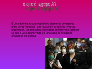 A gripe A é uma doença respiratória altamente contagiosa entre humanos que causa infecção respiratória. Acredita-se que o vírus tenha origem em mutações de porcos. Há medicamentos antivirais disponíveis no SUS com indicação médica para tratar a doença se tomados até 48 horas após os sintomas. Pacientes com sintomas devem procurar unidades de saúde públicas ou privadas para avaliação e possível encaminhamento a hospitais públicos para exames e tratamento.