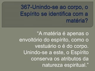 O documento discute a relação entre o espírito e o corpo material. Explica que o espírito usa o "perispírito", um corpo fluídico, para se manifestar na matéria. Também discute a doutrina da reencarnação, onde o espírito retorna à vida corporal sucessivas vezes para progredir moralmente através de novas provações.