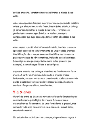 O documento descreve as principais etapas do desenvolvimento humano desde a infância até a terceira idade, incluindo características físicas, cognitivas e sociais em cada fase. As etapas incluem: infância (18 meses-3 anos, 3-4 anos, 5-9 anos), adolescência, fase adulta e terceira idade.