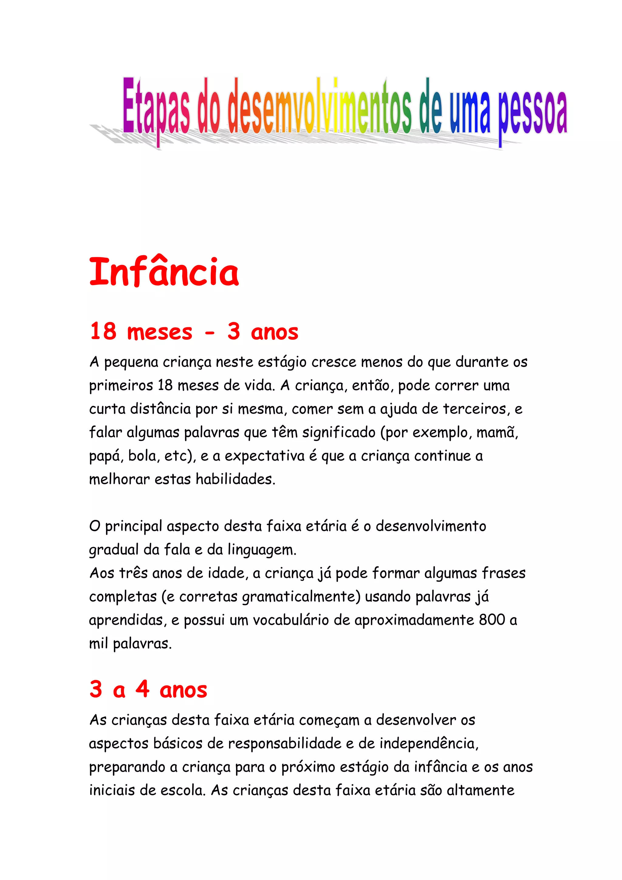 O documento descreve as principais etapas do desenvolvimento humano, incluindo a infância, adolescência, fase adulta e terceira idade. Na infância, destaca-se o desenvolvimento da fala e da linguagem entre 18 meses e 3 anos, e o desenvolvimento de responsabilidade e independência entre 3 e 4 anos. A adolescência é marcada por transformações físicas e hormonais durante a puberdade entre 10 e 14 anos. Na fase adulta, há mudanças como entrada no mercado de trabalho e formação de famílias. A terceira idade inicia ap