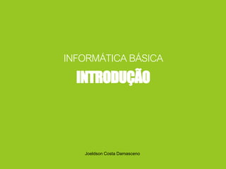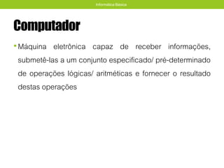 Este documento introduz conceitos básicos de informática. Explica que um computador é uma máquina eletrônica capaz de receber, processar e fornecer resultados de dados de acordo com instruções pré-determinadas. Também define um sistema de computação como a integração de hardware, software e pessoas que trabalham juntos para processar informações. Por fim, apresenta que a informática combina informação e automação no estudo da computação e da representação do conhecimento.