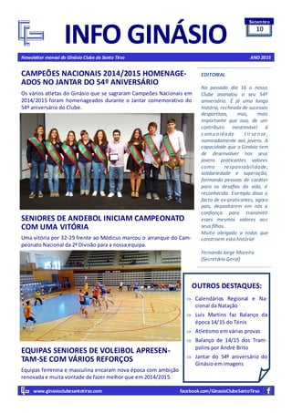 O documento resume as atividades e resultados desportivos do Ginásio Clube de Santo Tirso no mês de setembro de 2015, destacando (1) a vitória da equipa sénior de andebol na primeira jornada do campeonato, (2) o início dos treinos para as diversas modalidades como ginástica rítmica e ténis de mesa, e (3) a participação de atletas do clube em provas de atletismo.