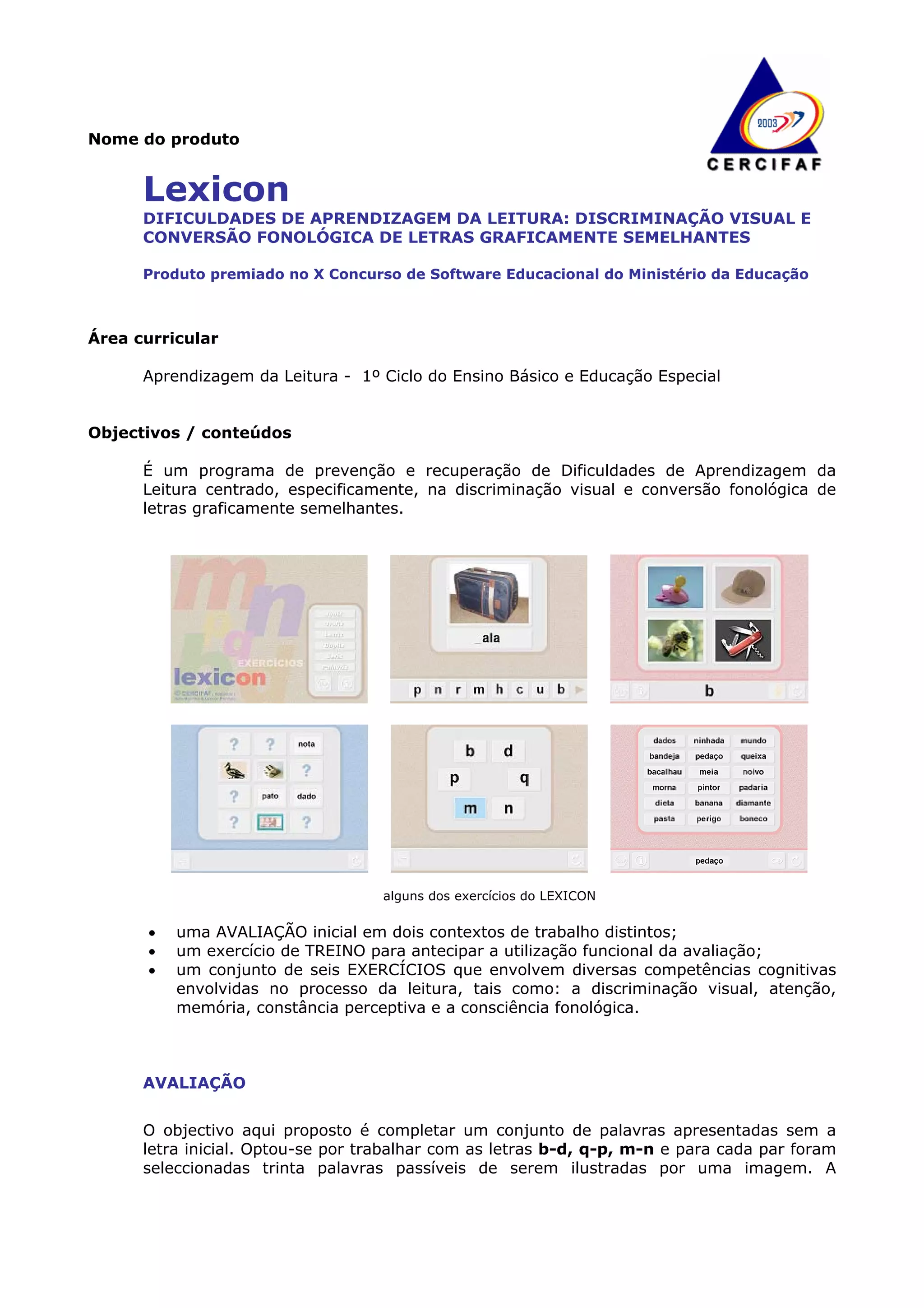 O programa Lexicon é um software educacional premiado que visa ajudar alunos com dificuldades de aprendizagem da leitura, focando-se especificamente na discriminação visual e conversão fonológica de letras graficamente semelhantes. Ele contém exercícios interativos para estudantes do 1o ciclo do ensino básico e educação especial, avaliando e treinando habilidades como atenção, memória e consciência fonológica.