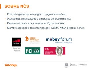 O documento descreve os serviços e soluções de mensagens móveis oferecidos pela empresa Infobip, incluindo SMS, USSD, voz, aplicativos e integrações. A Infobip é um provedor global de mensagens e pagamentos móveis com 40 escritórios em todo o mundo e capacidade de atender clientes em mais de 190 países.