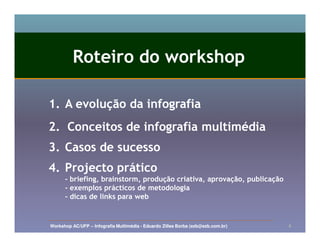 O documento apresenta um roteiro para um workshop sobre infografia multimédia, abordando sua evolução histórica, conceitos-chave e casos de sucesso. O roteiro inclui uma sessão prática de produção criativa de infografias para web.