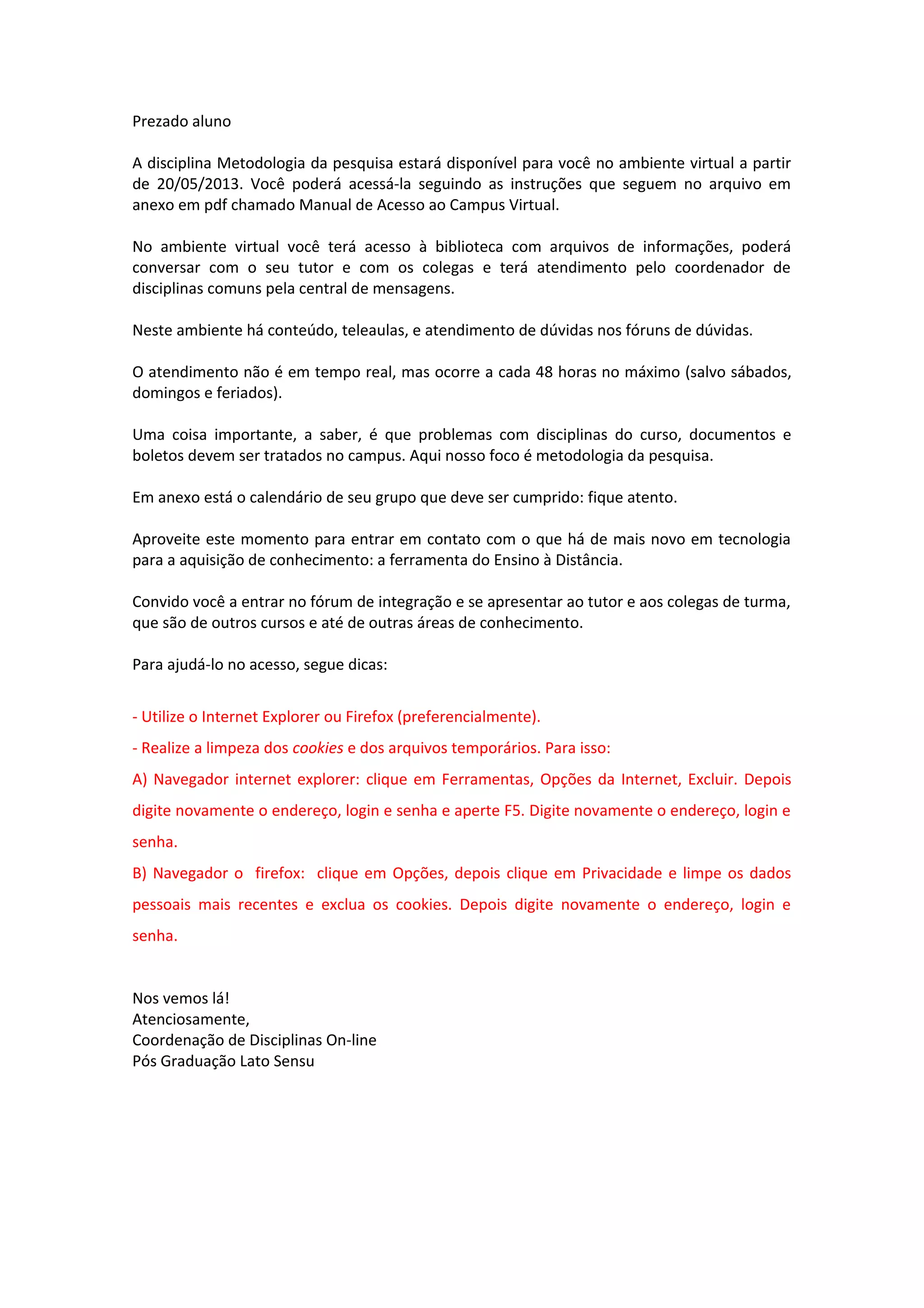 A disciplina Metodologia da pesquisa estará disponível no ambiente virtual a partir de 20/05/2013, onde os alunos terão acesso a conteúdos, fóruns e atendimento pelo coordenador. O calendário do grupo deve ser cumprido e problemas com disciplinas ou documentos devem ser tratados no campus. Dicas são fornecidas para acessar o ambiente virtual utilizando Internet Explorer ou Firefox após limpar cookies e arquivos temporários.