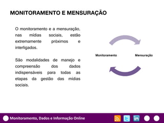 O documento discute a importância do monitoramento e mensuração de dados nas mídias sociais, destacando como esses processos são essenciais para a gestão eficaz da informação online. Enfatiza que, embora os dados sejam abundantes, é crucial filtrar e analisar aqueles que realmente impactam a tomada de decisões. Além disso, aborda o papel do boca a boca digital e como ele influencia o comportamento dos consumidores nas plataformas sociais.