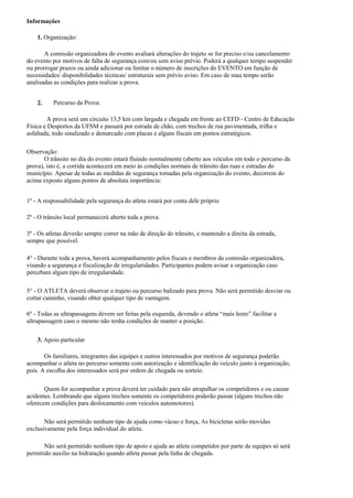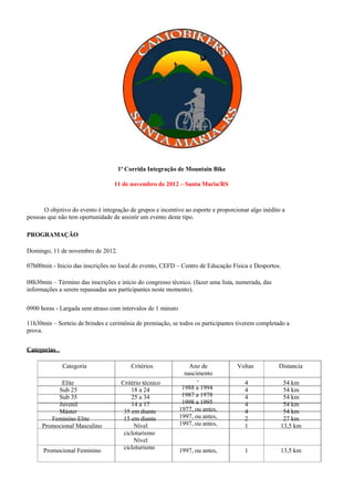 Este documento descreve uma corrida de mountain bike que ocorrerá em 11 de novembro de 2012 em Santa Maria, RS. O evento tem o objetivo de promover a integração através do esporte e oferecer uma experiência nova para aqueles sem muitas oportunidades. O documento fornece detalhes sobre a programação, categorias, percurso, inscrições, apoio, estrutura e regras do evento.