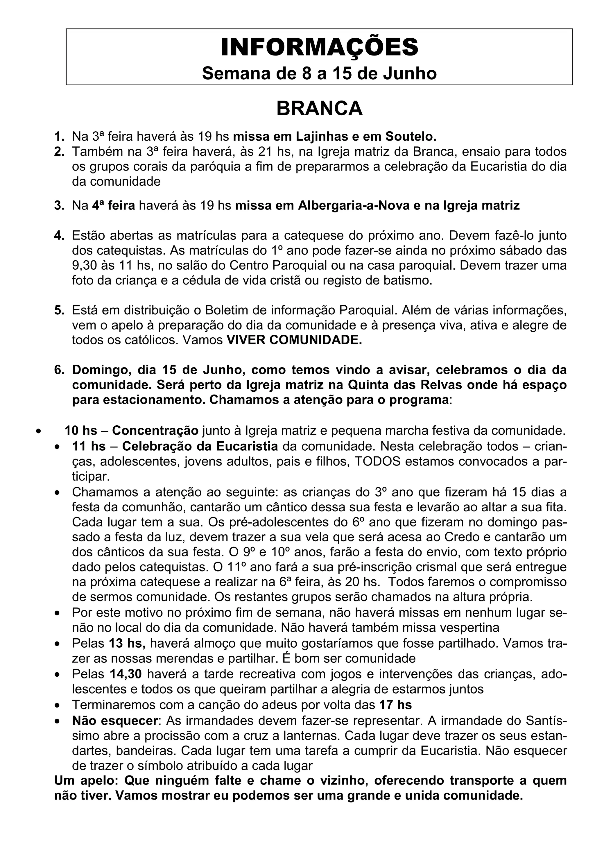 1. O documento lista os eventos da semana de 8 a 15 de Junho na paróquia de Branca, incluindo missas, ensaios corais e inscrições para catequese.